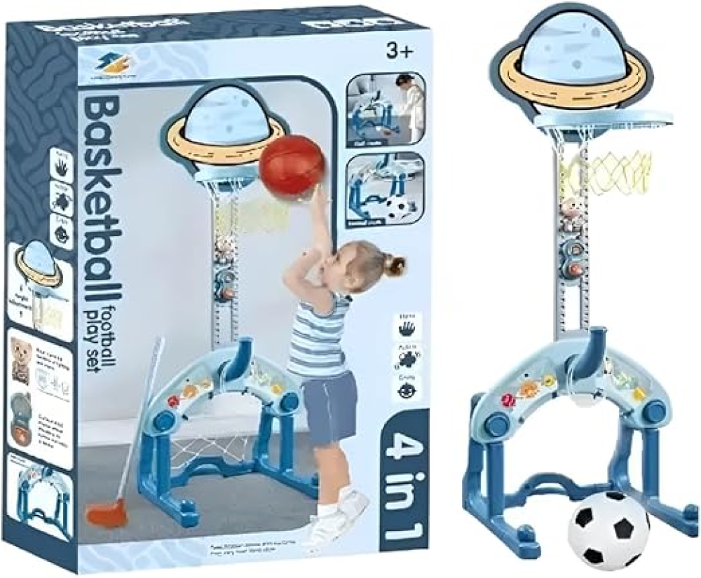 - مجموعة 4 في 1 تشمل كرة سلة، كرة قدم، وأدوات أخرى لألعاب متعددة.