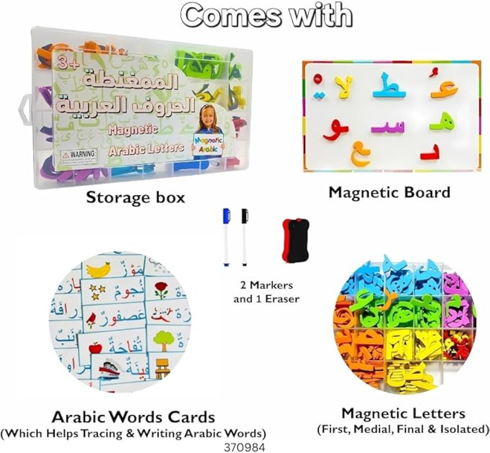 • تشمل سبورة مغناطيسية لكتابة الكلمات وتنظيم الحروف.